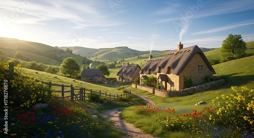 bungalow, village, hill, rolling, landscape, countryside, thatched, roof, green, grass, field