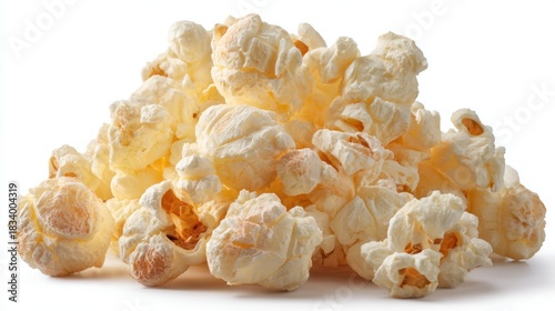 Pieces of popcorn are seen floating in a shallow depth of field. The texture is clear and the details highlight the unique shapes of the popcorn on a transparent background