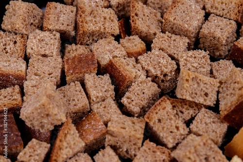 Pieces of roasted brown bread on a dark background. Close-up of delicious croutons.