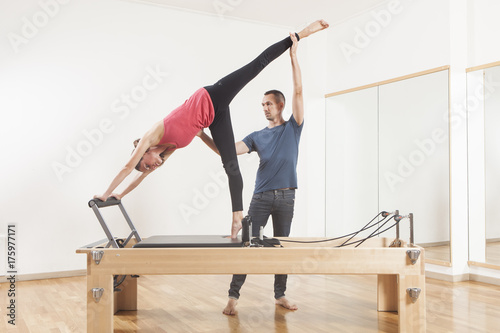Pilates lesson on reformer, personal coaching young beautiful woman