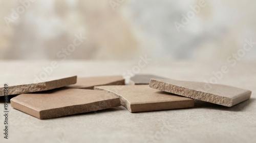 tile, ceramic, broken, fragment, material, construction, surface, texture, debris, detail, natural, earthy, neutral, stone, rough, edge, layer, pattern, abstract, design, element, component, building, home, renovation, repair, damaged, chipped, scattered, pile, stack, group, several, few, closeup, macro, sharpened, background, blur, light, shadow, contrast, colours, brown, grey, beige, rustic, vintage
