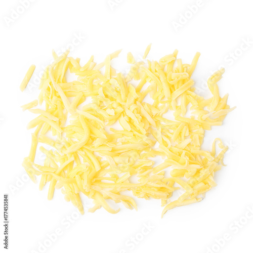 Pile of grated cheese isolated on white, top view
