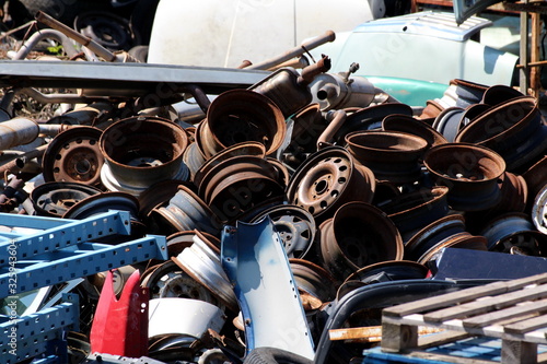 Pile of old rusted car rims mixed with various other car parts left in local scrap yard for recycling and reuse on other cars