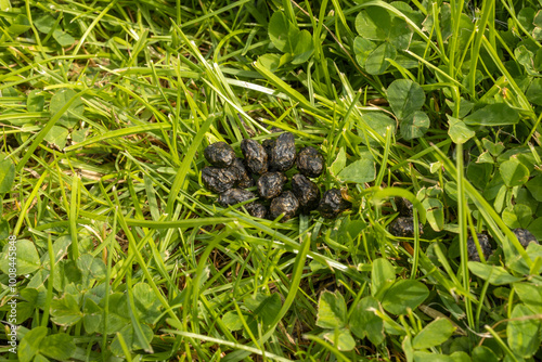 Pile of round dark rabbit droppings on green lawn with grass blades and clover