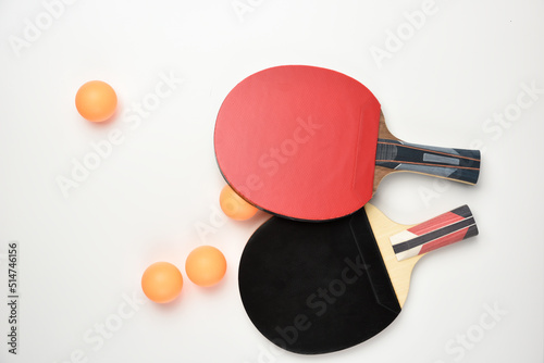 Ping pong racket in red and black color with orange ping pong balls on white background, isolated.