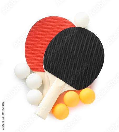 Ping pong rackets and balls isolated on white, top view