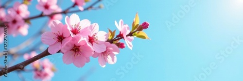 Pink cherry blossoms on a light green wooden branch against a blue sky, light green, spring, blue sky