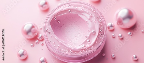 cream, cosmetic, skincare, beauty, jar, pink, pearl, moisturiser, lotion, face, care, treatment, product, elegance, luxury, texture, smooth, soft, delicate, shiny, glossy, bubble, container, round, sphere, gloss, glow, feminine, gentle, radiant, healthy, skin, natural, white, transparent, background, top, view