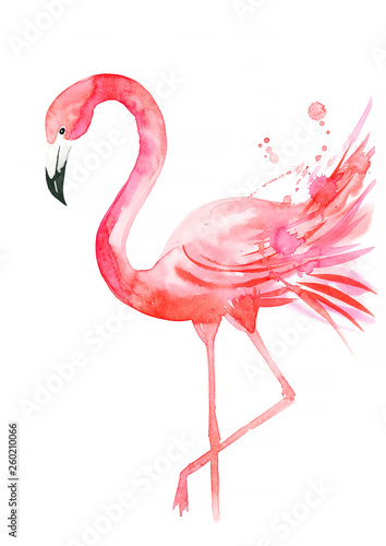 Pink flamingo on a white background, watercolor painting, illustration of animals