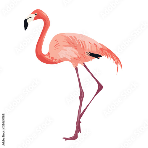 Pink flamingo on white background. Tropical and exotic big bird lives on salt lakes. Isolated vector illustration.