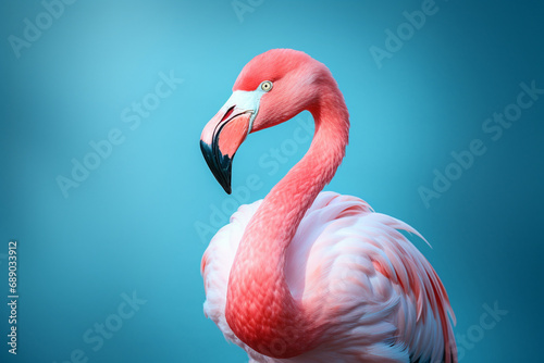 Pink Flamingo's Graceful Detail Against a Tranquil Blue Background. Ai generated