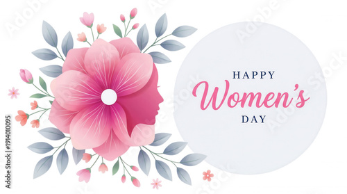 Pink flower silhouette of woman's profile with Happy Womens Day text on white circle international womens day