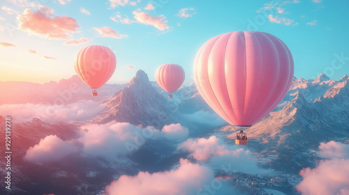 pink hot air balloons in the sky over the mountains, aeronautics, air transport, fabulous landscape, beauty, nature, flight, basket, movement, fantasy, dream, travel, vacation