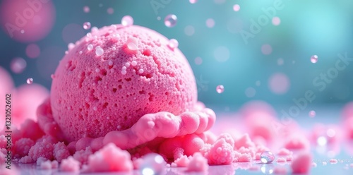 Pink ice cream macro shot, showcasing air bubbles and crystals, detail, pink