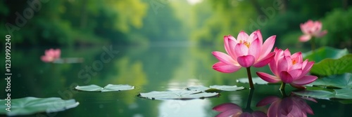 Pink lotus blooms in tranquil lake surroundings, natural scenery, soothing