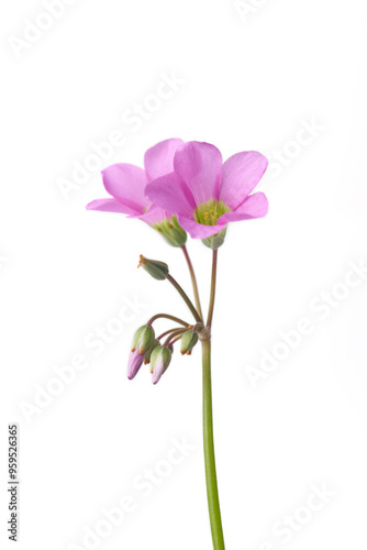pink oxalis or wood sorrel, false shamrock, delicate small vibrant flowers bloom spring to autumn isolated white background, taken in selective focus