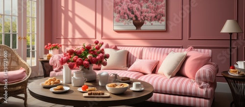 sofa, pink, room, breakfast, pastry, sunlit, flower, interior, home, design, spring, cosy, comfortable, morning, light, elegant, style, living, tea, hot drink, cushion, table, decor, sweet, delicious, relax, calm, peaceful, aesthetic, beauty, happy, fresh, floral, bright, luxury, modern, vintage, charming, serene, comfort, delightful