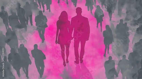 Pink silhouette of couple standing in monochrome crowd of different people,surreal unique and different concept,loneliness in society,shadow,freedom,Love,be yourself,Stand out from the crowd.