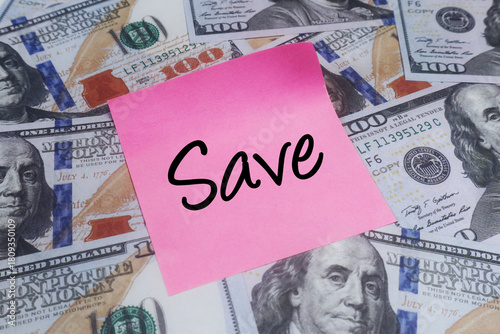 Pink sticky note with Save on US dollar bills, symbolizing financial prudence, strategic savings, and future wealth management