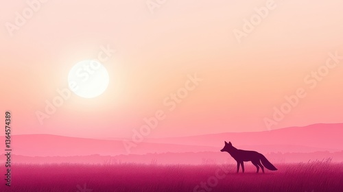 fox, sunset, silhouette, landscape, pink, sunrise, nature, animal, wildlife, serene, peaceful, calm, tranquil, background, wallpaper, illustration, digital artwork, graphic, design, art, minimalist, abstract, pastel, soft, romantic, dreamy, beautiful, picturesque, scenic, wilderness, field, grass, horizon, sky, sun, light, colours, vibrant, mood, atmosphere, vector, image, royalty free, pink sky