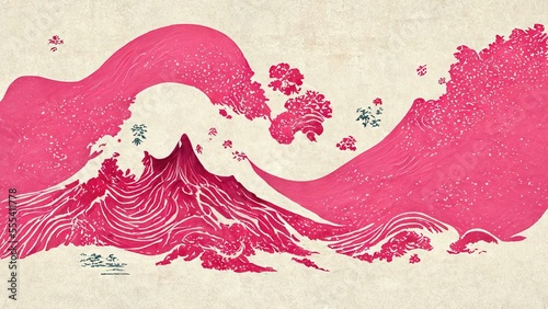 Pink waves and mountains, abstract and striking, retro and elegant in the ukiyoe style of Katsushika Hokusai Japanese traditional and graphic design produced by Ai