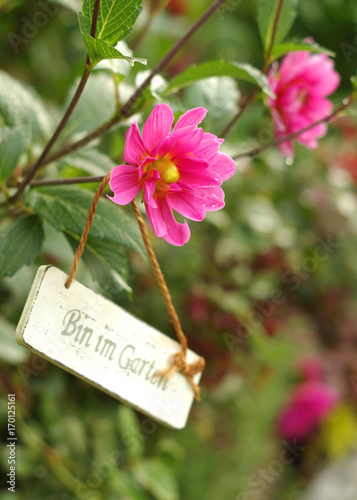 pinkfarbene Dahlien mit Schild " Bin im Garten " im Freien
