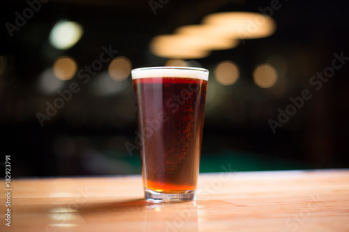 Pint of a dark ale on a wood counter at a pool hall bar