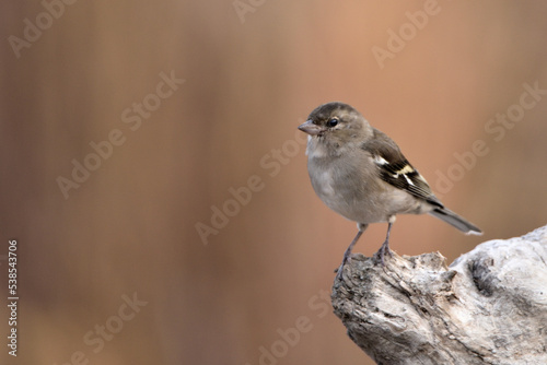 pinzón vulgar (Fringilla coelebs) posado en un tronco seco con fondo marron