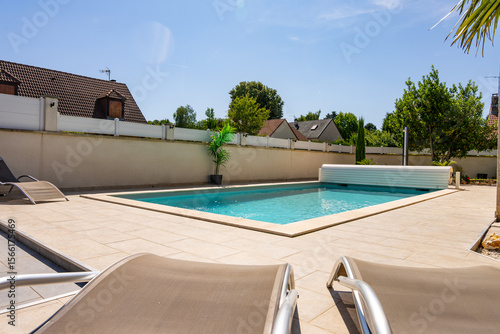 Piscine privée avec margelles en pierre beige, entourée de verdure et équipée d’un rouleau pour bâche, dans un jardin paysager.