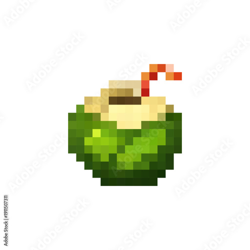 Pixel Art Coconut Drink Icon Retro 8 Bit Tropical Green Coconut with Straw, Isolated Pixelated Summer Beverage Game Asset for UI, Mobile App and Vintage Arcade Style Design
