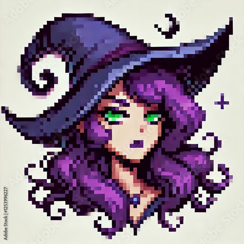 isolate, rpg, sorcerer, sorceress, mage, magician, mystic, magic, fantasy, enchanted, spell, power, portrait, character, artwork, digital, pixel, pixelated, game, mediaeval, retro, glowing, eye, aura, green, purple, hat, necklace, charme, mystical, detailed, classic, vintage, dark, beauty, epic, high-coloured, vibrant, captivating, intricate, high, render, creative, masterpiece