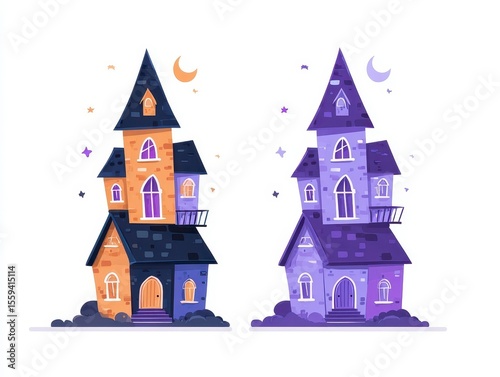 Pixel Art Haunted Houses Orange and Purple Halloween Homes Under Crescent Moon