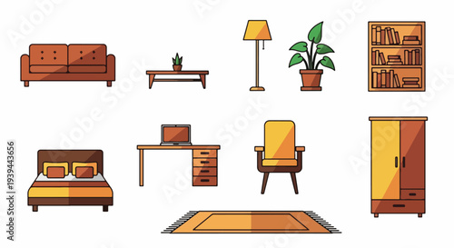 furniture, home, interior, sofa, bed, desk, clothes rack, bookshelf, armchair, coffee table, floor lamp, potted plants, icon, set, collection, design, graphic, element, object, modern, simple, flat, retro, pixelated, vector, digital artwork, computer, bedchamber, living room, office, object, cartoon, illustration, symbol, decorative, isolated, asset, art, creative