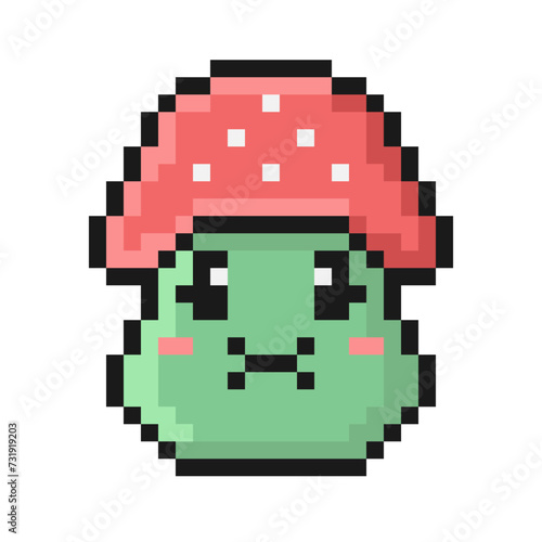 Pixel style fly agaric mushroom illustration. Cartoon nauseated face.