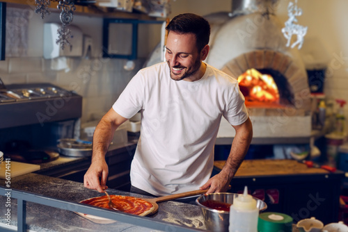 commercial, eatery, uniform, italian, kitchen, preparing, chef, cookery, dough, pizza, working, culinary, preparation, professional, footed, pizzeria, fire, epicure, hotel, put, man, concept, traditional, mozzarella, oven, food, staff, standing, ladle, cooking, making, cheerful, meal, catering, person, white, occupation, portrait