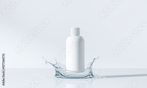 plain white mockup bottle for facial cleanser surrounded by clear splash of water on white background creates serene and refreshing atmosphere
