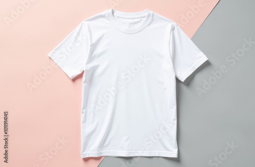 Plain white T-shirt on a pastel background in flat lay Fashion apparel template, mockup design, minimalist clothing mockup