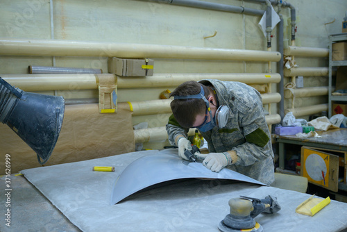 Plane assembly shop. Worker fitting part of fuselage of a light plane