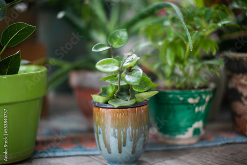 plant in a ceramic blue and brown pot