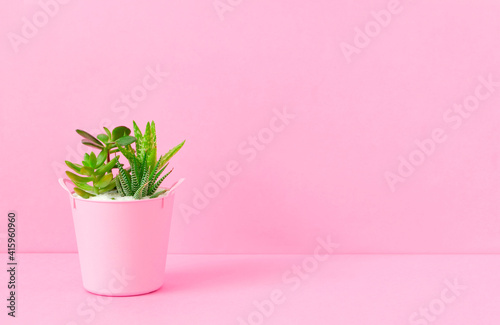 plant, green, pink, table, mounting, background, environment, pretty, succulent plant, cactus, plante, pot, pot, flowerpot, woman, sweet, pastel, pastel colour, garden, gardening, indoor, room, indoor, open air, space, copy space, conformity, unmanned, bucket, desk, table, pop, wall