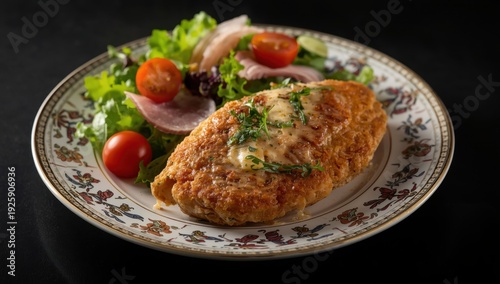 Plate of chicken cordon bleu cutlet with cheese and ham, served with salad. Black backdrop. Aerial perspective