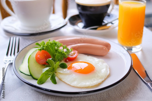 Plate of food with eggs, sausage, tomatoes, and orange juice on a table