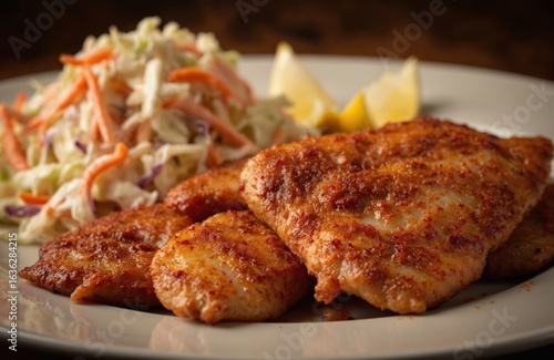 Plate of fried fish seasoned with Cajun spices. Served with creamy coleslaw and lemon wedges. Delicious seafood dish, perfect for lunch or dinner. Culinary delight with contrasting flavors.