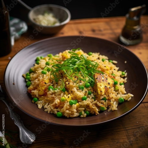 plate of Fried Rice garnished with scrambled eggs and spring onions, served on a dark wood table