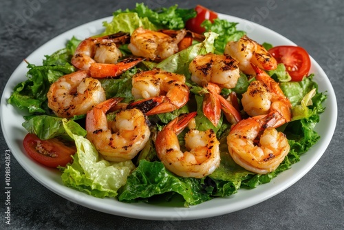 Plate of grilled giant shrimp salad Gray backdrop Overhead view Empty space available