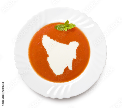 Plate tomato soup with cream in the shape of Tasmania.(series)