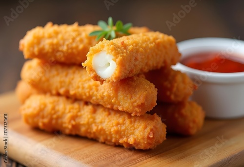 Plate with hot chili sauce and nuggets on wooden table, closeup