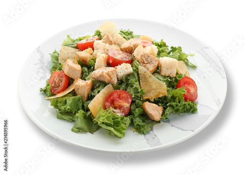 Plate with tasty Caesar salad on white background