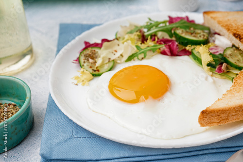egg, fried, light, plate, salad, table, tasty, toast, arugula, background, bread, breakfast, cabbage, calcium, calorie, chicken, colours, cook, cucumber, culinary, delicious, diet, dish, eat, food, fresh, greener, healthy, homemade, ingredient, meal, morning, napkin, natural, nobody, nourishment, object, organic, product, protein, receipe, roasted, side, spice, sunny, vegetable, vitamin, white, yellow