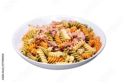 Plato de pasta en espiral rizada con atún en plato con fondo blanco